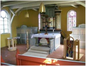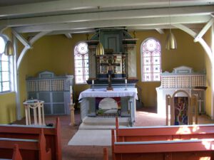 Der Kanzelaltar stammt von 1704, wobei die Kanzel wohl erst später eingefügt wurde, an Stelle eines ursprünglichen Abendmahlsbildes, das jetzt die südliche Seitenwand ziert.