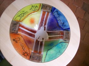 Die Glaskünstlerin Gitte Graver aus Ribe in Dänemark gestaltete die Taufschale in den Farben des Regenbogens, der Elemente und der Himmelsrichtungen.