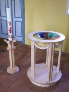 Die Holzarbeiten von Taufe, Taufkerze und Lese/Predigtpult wurden von dem Tischlermeister Jürgen Winter aus Neuland gestaltet.